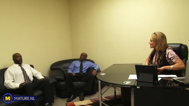 30 year old MILF Nikki Sexx threesome fucked by two big hard cocked black dudes in her office